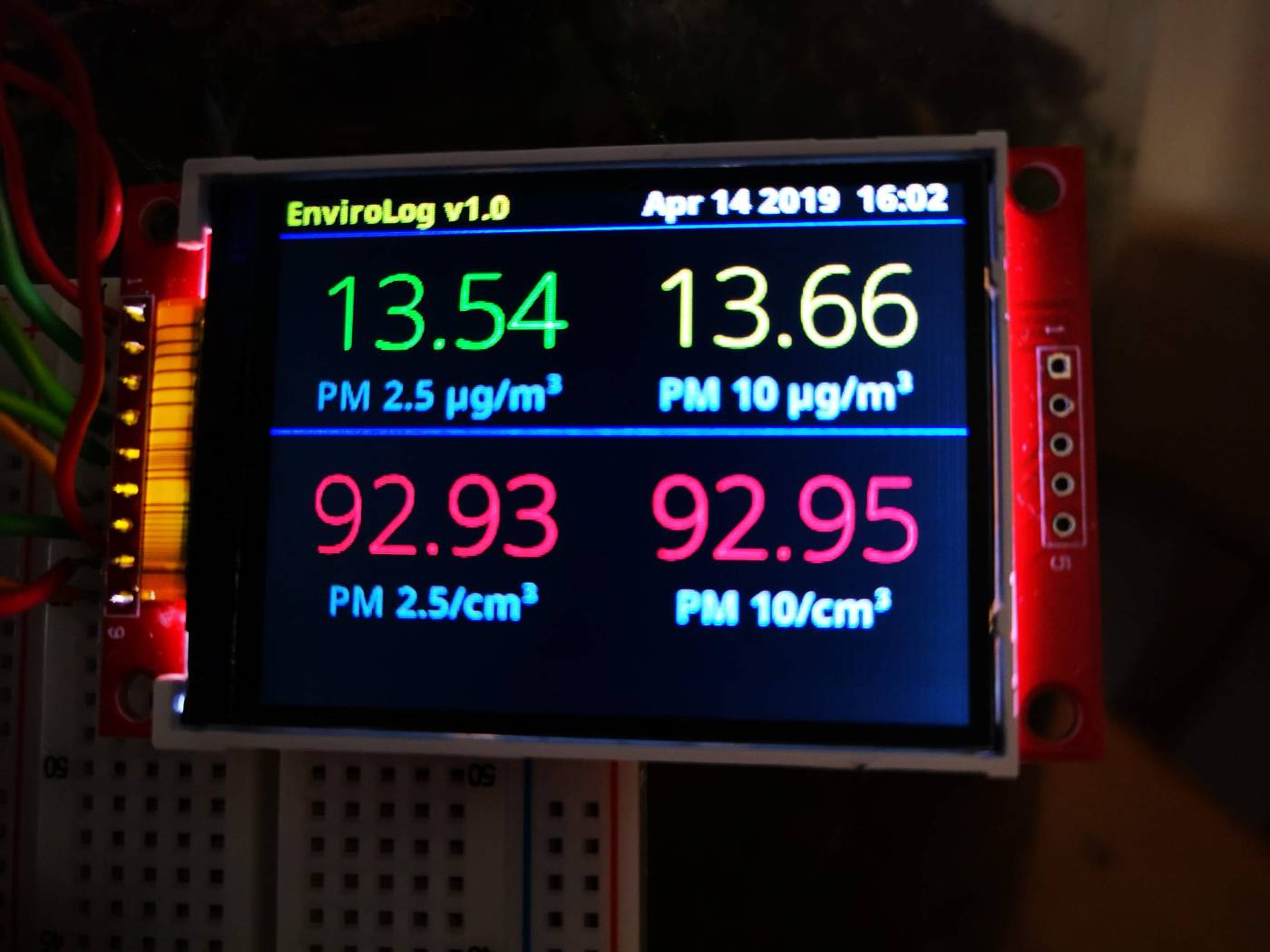 In the image above you can see the current output on the display. Top left and right I am showing the number of particles of sizes 2.5 microns or smaller and 10 microns or smaller respectively per metre cubed. The bottom shows the concentration of these sized particles per cm cubed. I am using a NEO-6M GPS module to provide the data and time for logging purposes. I will also be using this to log the location for when the device is being used during travel or in different locations.