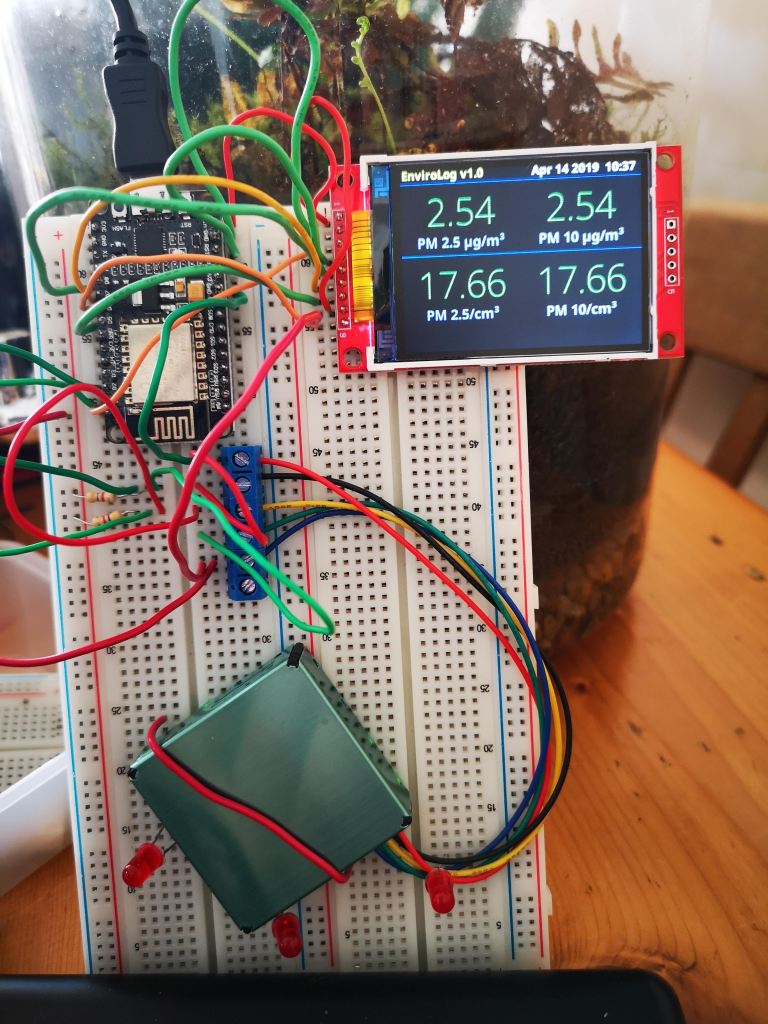 So, the micro-controller I am using for this project is a NodeMCU Amica which is an ESP8266 based device. The advantage of this is a fast processor (up to 160MHz) lots of memory (4Mb) and plenty of pins broken out to add peripherals to. I am currently using a small ILI9341 based TFT colour display and have an Sensirion SPS30 particulate sensor attached to display the size and concentration of particles. I also have an MQ9 Carbon Monoxide sensor and a MH-Z19 Carbon Dioxide sensor. Both have yet to be attached.