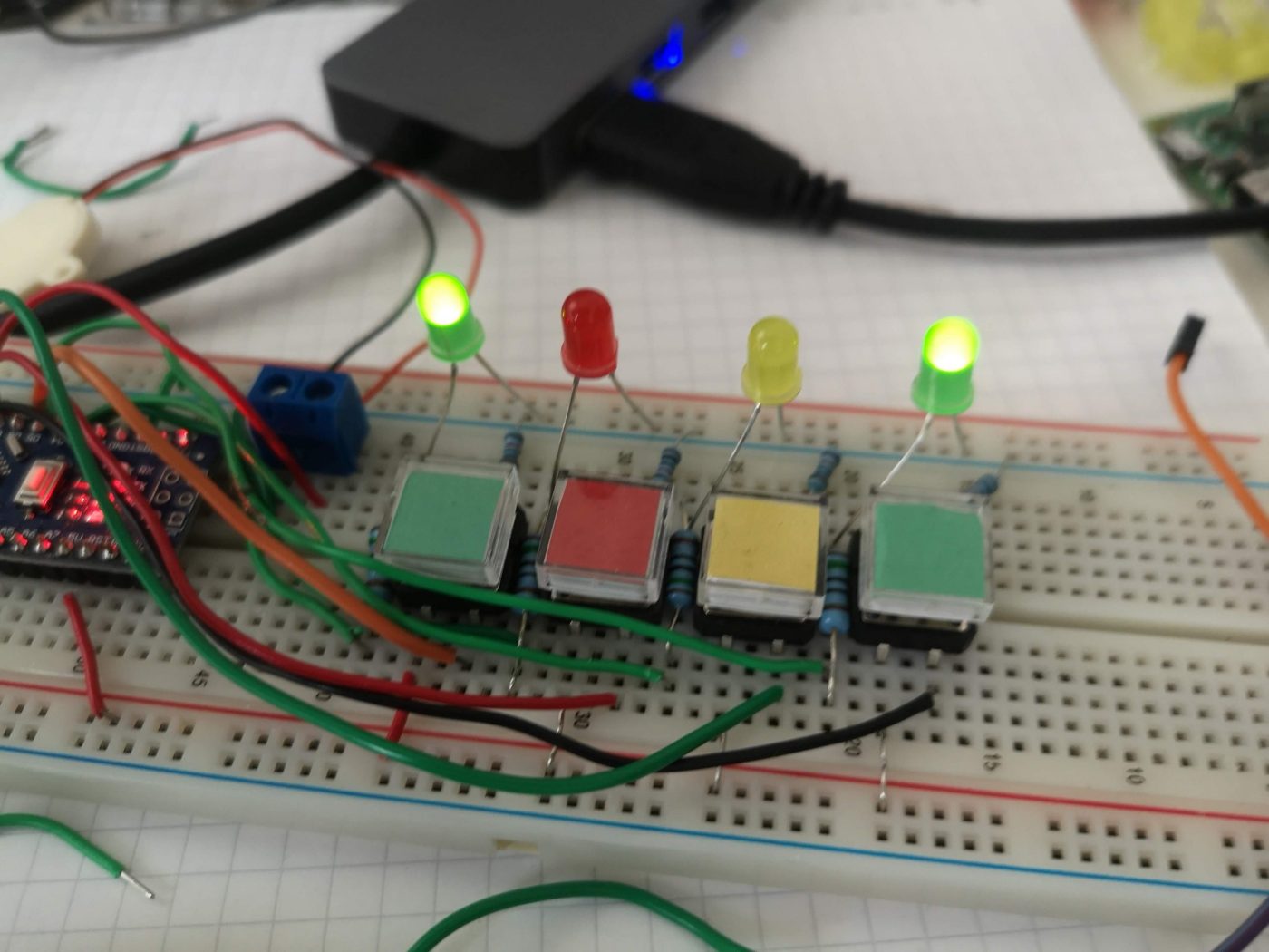 We used an Arduino Nano, 4 large buttons with clear caps and 4 LEDs, plus piezo buzzer for the tunes. The circuit is really simple with pull down resistors on each button and current limiting resistors on each LED.