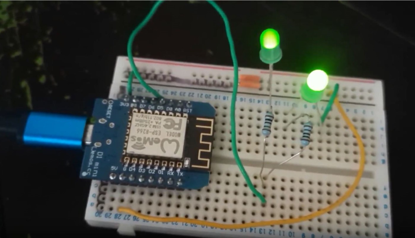 Not many people know that it is possible to control 2 LEDs individually with just a single digital output pin. See the video below for proof. These 2 LEDs are both connected to the same pin, digital pin D5 on a Wemos D1 mini.